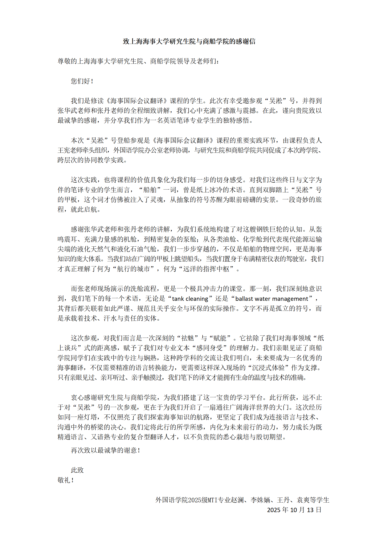 近日,研究生院收到了25级外国语学院研究生的感谢信,信中对学校组织的“吴淞”号实训船实践教学活动给予了高度评价,称赞本次教学活动为研究生开启了一扇通往海洋世界的大门。